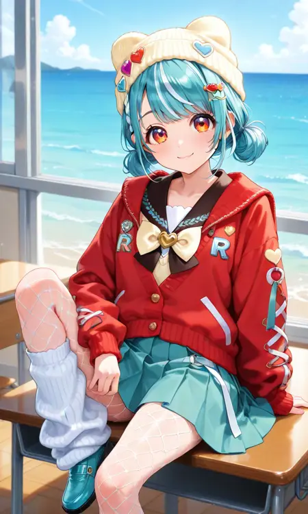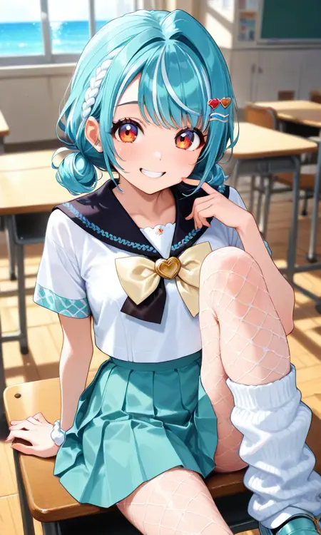 shiranami ramune, ramune sailor, short hair, low twintails, drill hair, hairclip, serafuku, bowtie, yellow bow, white shirt, short sleeves, aqua skirt, pleated skirt, fishnet pantyhose, leg warmers可通过使用