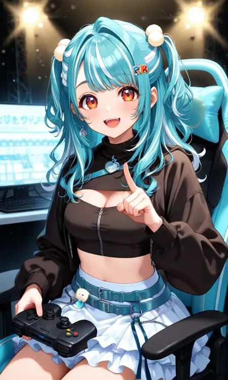 shiranami ramune, ramune gamer, long hair, ponytail, hair ornament, black shirt, crop top, clothing cutout, cleavage, arm warmers, midriff, blue belt, white skirt, frilled skirt可通过添加