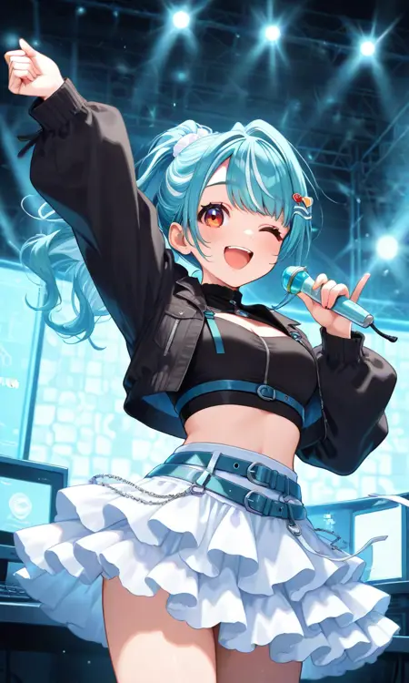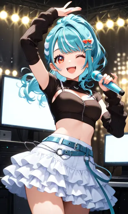 shiranami ramune, ramune gamer, long hair, ponytail, hair ornament, black shirt, crop top, clothing cutout, cleavage, arm warmers, midriff, blue belt, white skirt, frilled skirtYou can add a jacket to her by adding