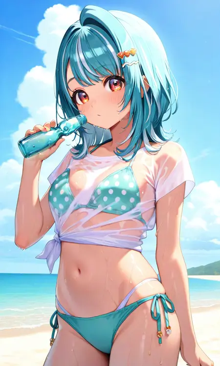 shiranami ramune, ramune summer2023, medium hair, hair ornament, aqua bikini, polka dot bikini, side-tie bikini bottom, see-through shirt, short sleeves- 可移除提示词中的