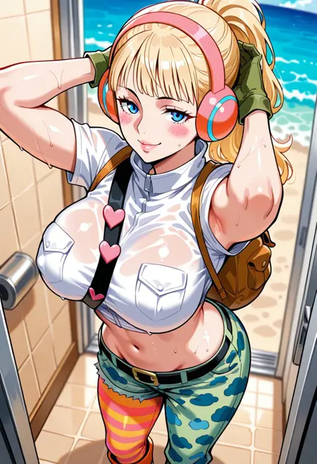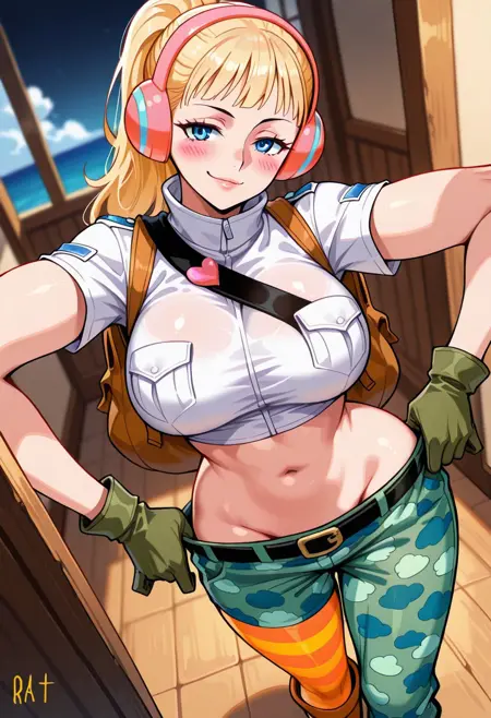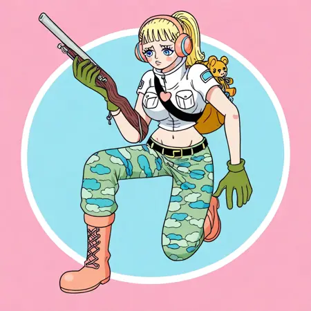 HibariOP, 1소녀, 솔로, 금발, 긴 머리, 꼬마머리, 앞머리, 파란 눈, 입술, 파란 줄무늬가 있는 분홍색 헤드폰, 뺨 스티커, 큰 가슴, 흰색 군복 주머니 셔츠, 녹색 장갑, 배꼽, 복부, 사타구니, 허리에 분홍색 심장 모양 버클이 달린 검은 벨트, 주황색 군화, 바다 거품 녹색 캠ouflage 팬츠, 삼색 구름 무늬 팬츠, 노랑과 주황 줄무늬 레깅스, 갈색 배낭에 파란 테디 베어가 매달려 있음, 비대칭 다리 신발, 벨트, 넓은 엉덩이, 무기, 소총,