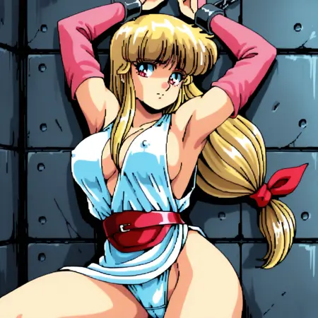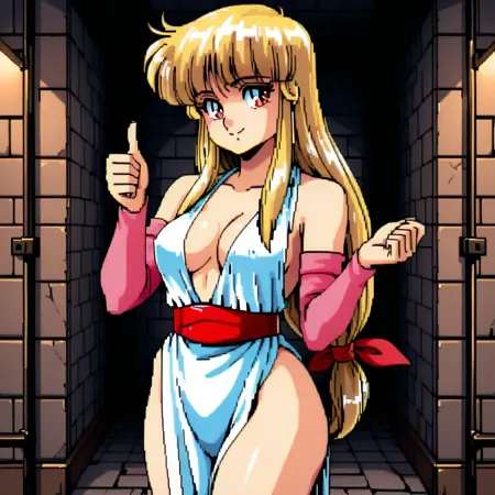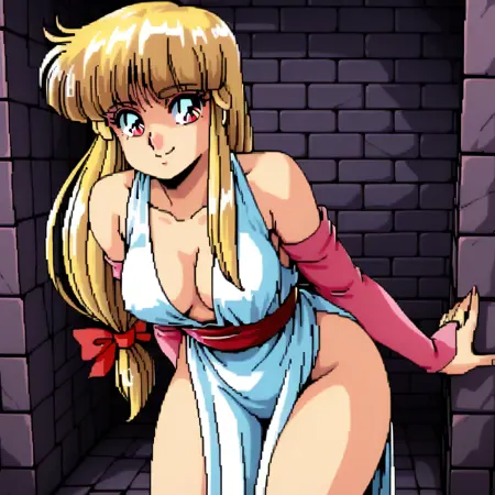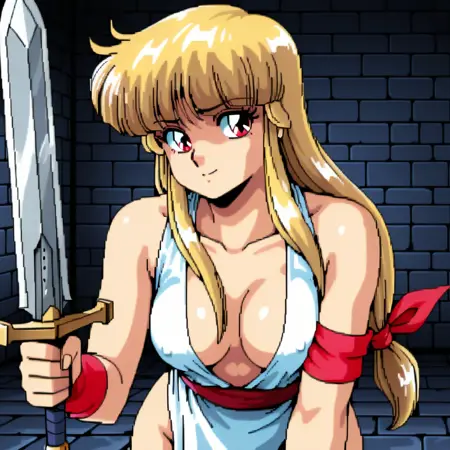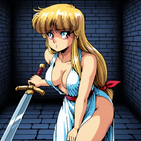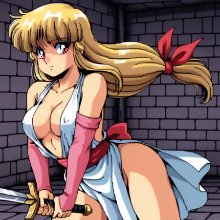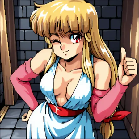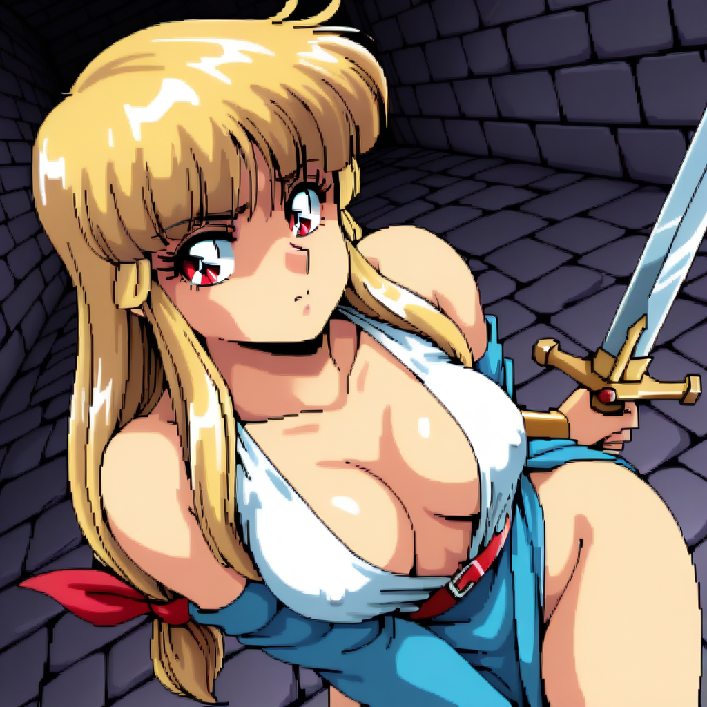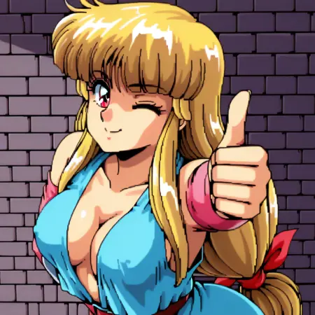 **トリガー語:**dkjane,1girl,solo,blonde hair, breasts,red eyes, cleavage,bangs, medium breasts,retro artstyle,