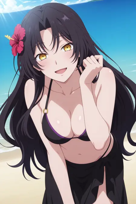 dominique de sade, long hair, black hair, curtained hair, yellow eyes, long sleeves, military uniform, white jacket, high collar, epaulettes, black bow, sash, pink gloves, white pants, black boots, thigh boots, high heel boots