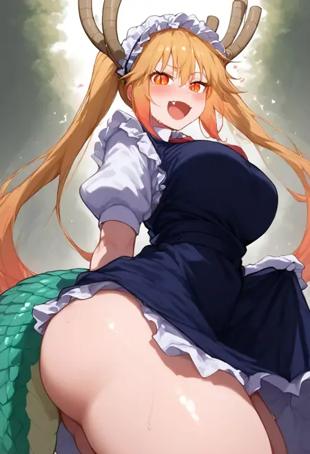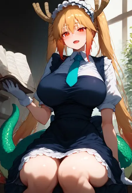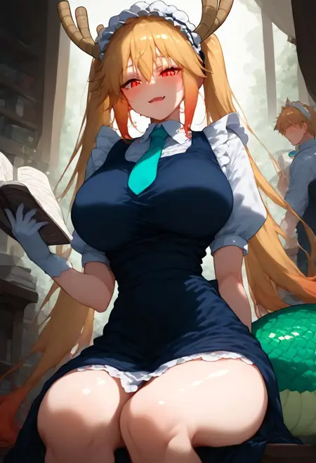 1girl,托尔,龙女,长发,极长发,双马尾,刘海,金发,多色发,渐变发,发丝间于眼间,红眼,竖瞳,角,龙角,獠牙,尾巴,龙尾,鳞片,大尾,女仆装,短袖,白手套,手套,领结,女仆头饰