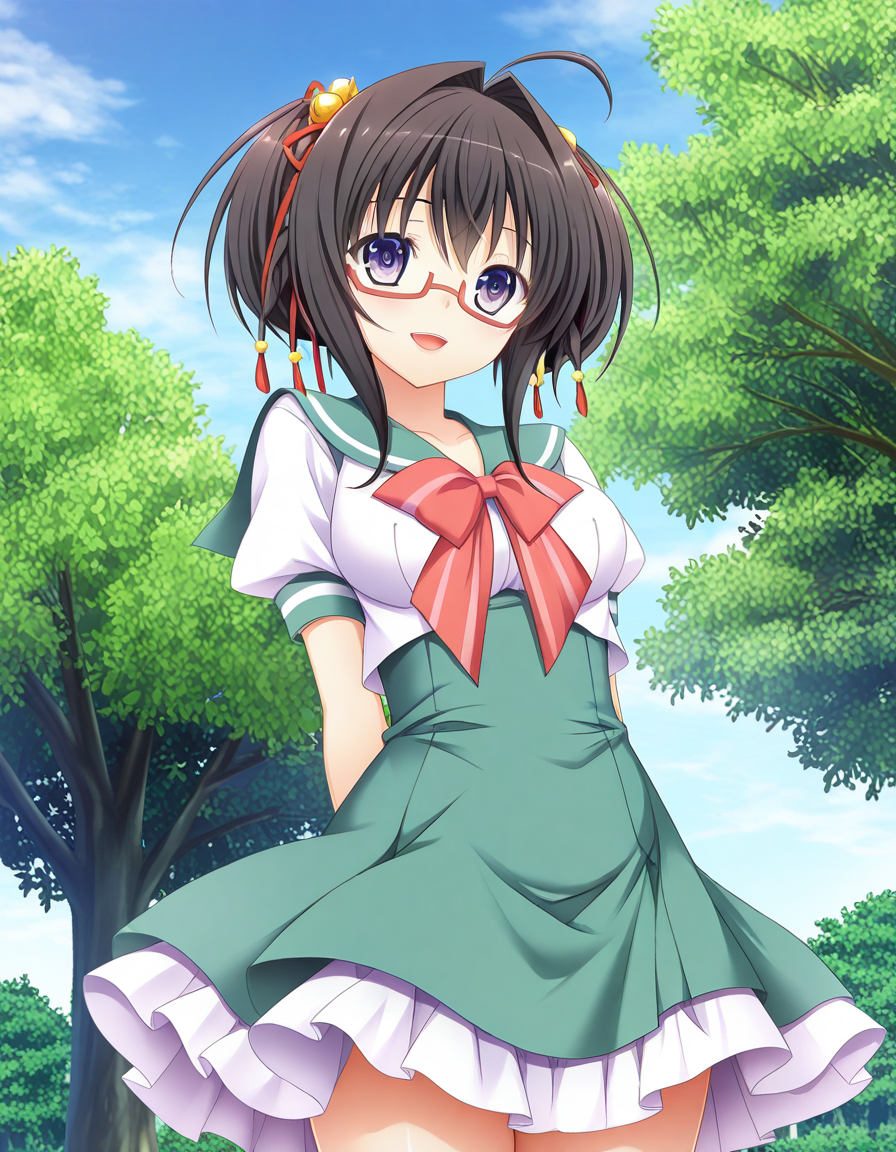 hayasaki naru, 黑发, 短发, 发丝飘动, 发饰铃铛, 紫色眼睛, 红色眼镜, 半框眼镜, 校服, 绿色水手领, 白色衬衫, 连衣裙, 裙子