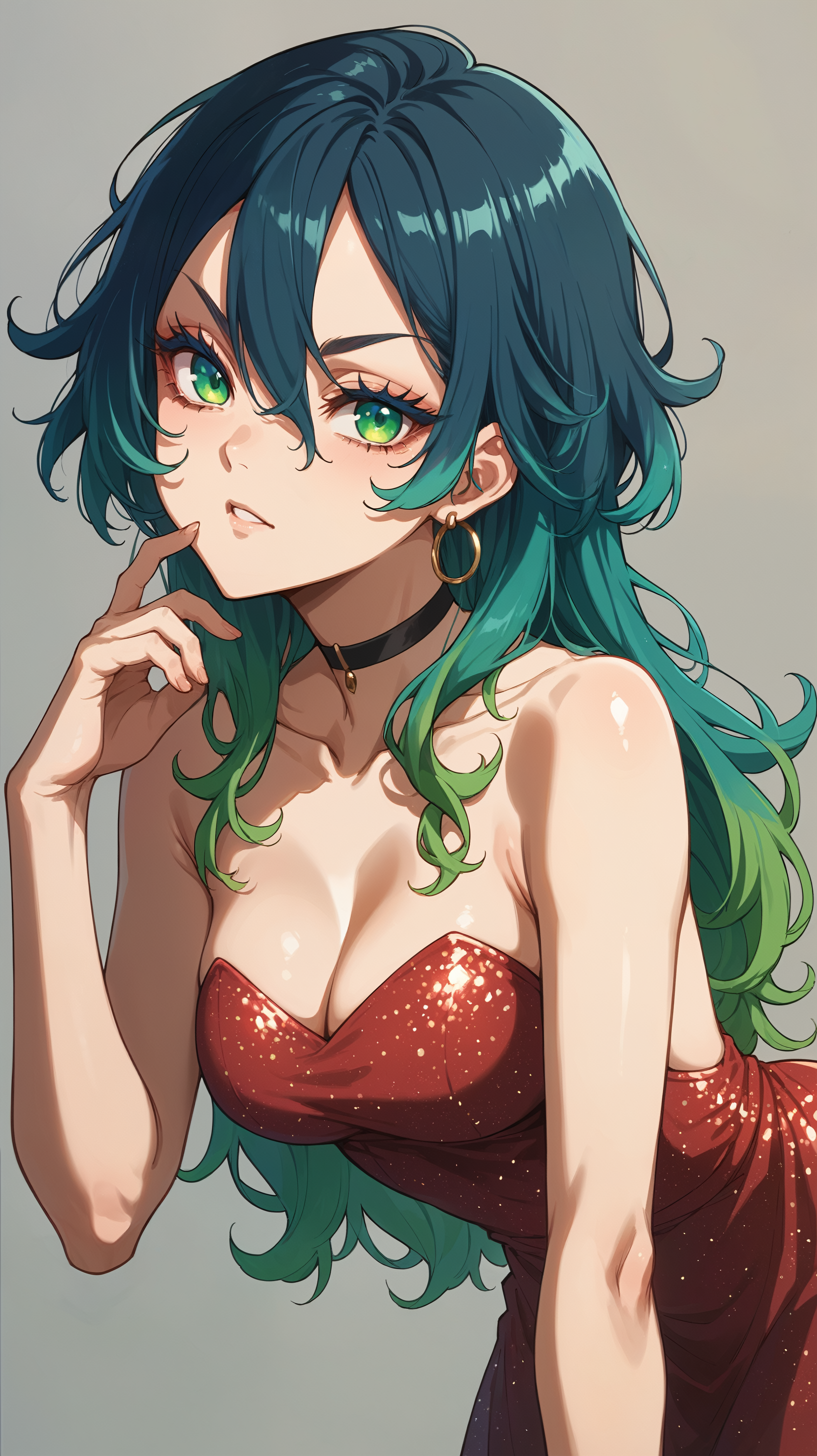 long hair, dark blue hair, gradient hair, multicolored hair, dark blue roots, green hair, colored tips, green tips, green eyes, messy hair, hair between eyes, loop earrings, black choker, thick eyelashes,