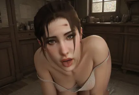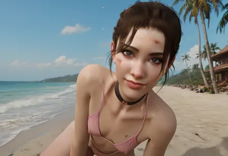 佐伊,绿色眼睛,棕色头发,刘海,马尾辫,胸部小巧,红色夹克,牛仔裤,白色运动文胸,