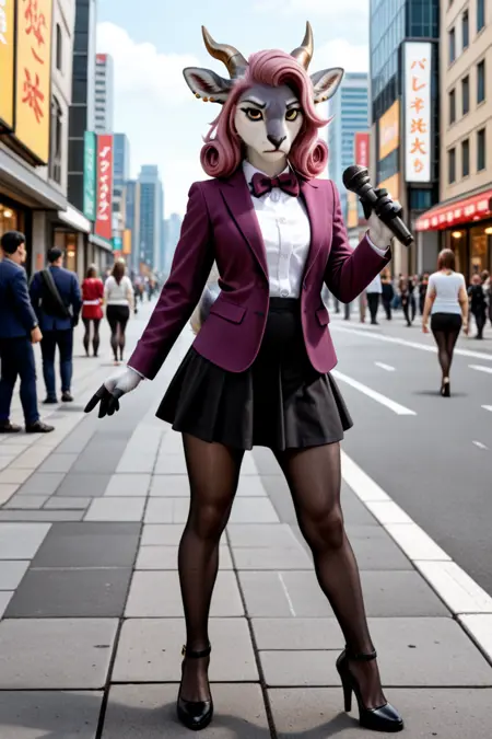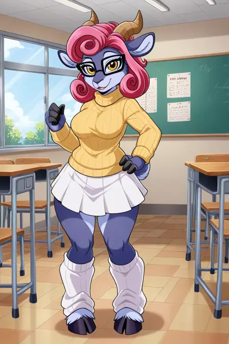 Tags: Absa, anthro, furry female, pink hair, goat horns, goat tail, yellow eyes, hooves