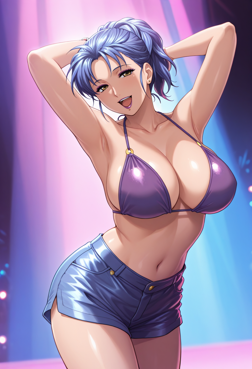 ayaya, 1girl, blue hair,yellow eyes,ponytail, hair up, short hair,large breasts,mature female,