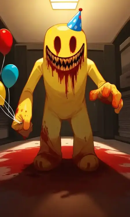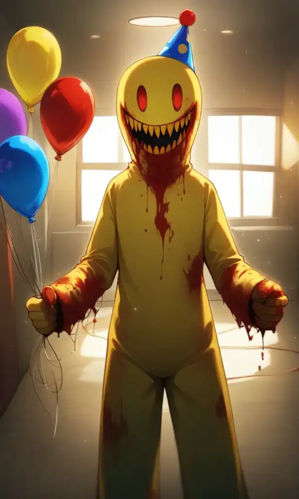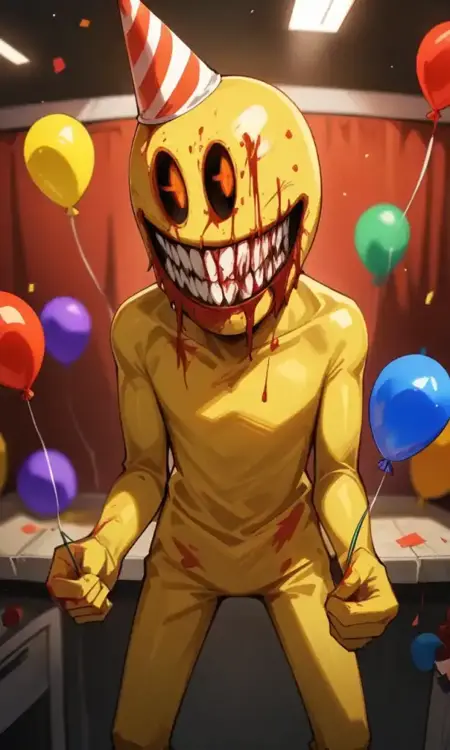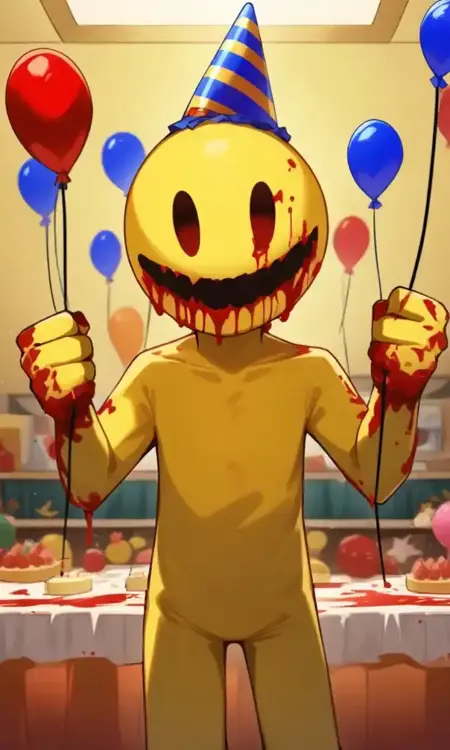 partygoer, Smile, Yellow skin, standing, Looking at viewer, holding balloon, creature, party hat, indoors, Smiley face, blood on mouth, hole with teeth on hand, androgyn