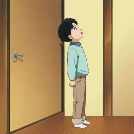 Outfit 1: male, male child, child, black hair, brown eyes, turquoise collared shirt, brown pants, white socks, indoors (hallway/door), indoors (bedroom), indoors (classroom), outdoors (porch)