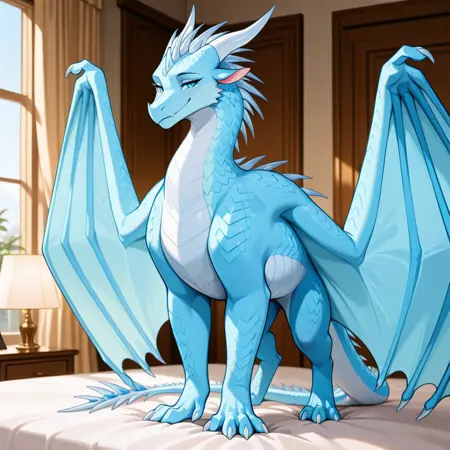 附加提示词:dragon, horns, claws, wings, tail, icewing spikes, white scales