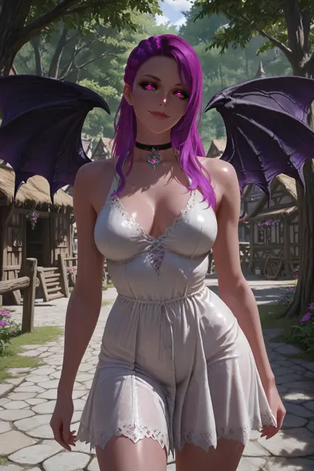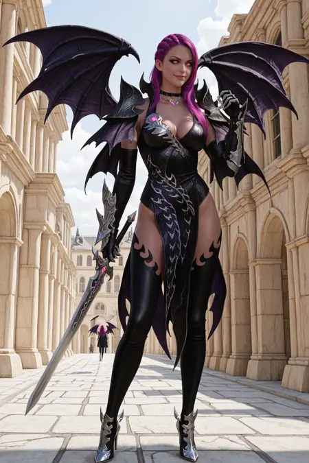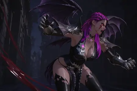 트리거: shdwhnter, 긴 머리, 악마의 날개, 드레스, 빛나는 눈, 어깨갑옷, 붉은 눈, 땋은 머리, 메이크업, 팔꿈치 장갑, 가슴 노출, 목걸이, 검은 허벅지 스타킹, 장갑, 발톱, 하이힐
