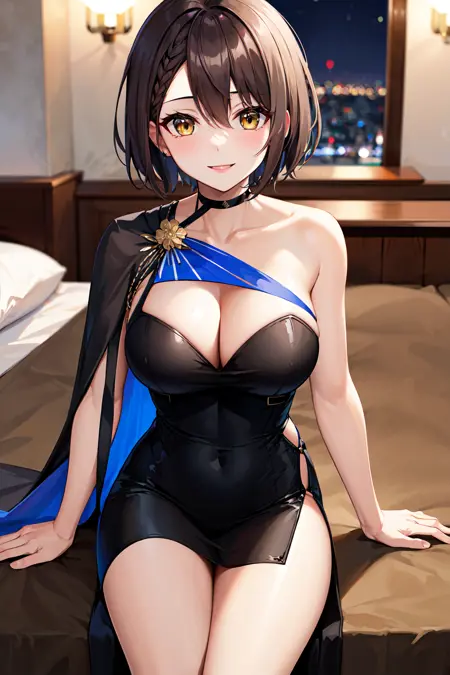 衣装4ddbalti, short hair, ahoge, choker, blue cape, single bare shoulder, evening gown, cleavage, collarbone, black dress, side slit