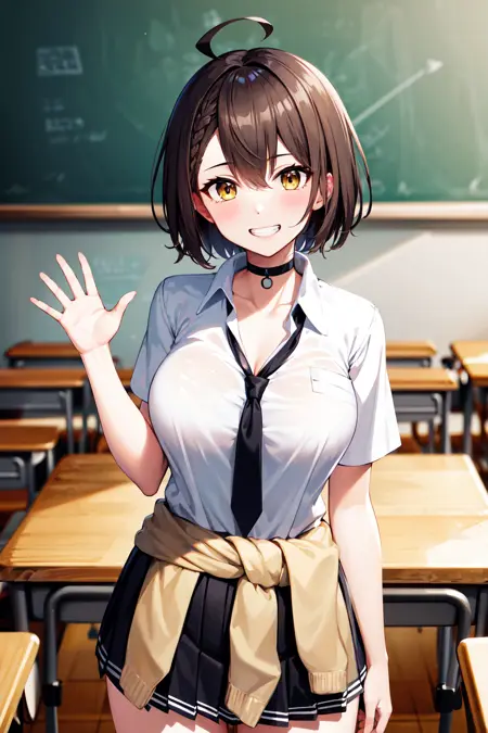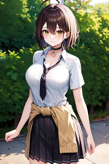 衣装2bbbalti, short hair, ahoge, french braid, black choker, school uniform, black necktie, cleavage, white shirt, short sleeves, cardigan around waist, pleated skirt, black skirt, loose necktie