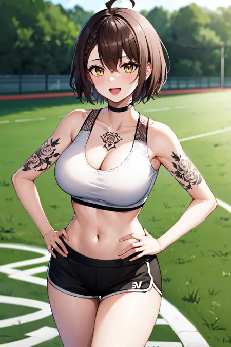 衣装3(ジャケットなし)ccbalti, short hair, ahoge, french braid, tattoo, black choker, bare shoulders, cleavage, white sports bra, white shirt, midriff, black shorts, short shorts