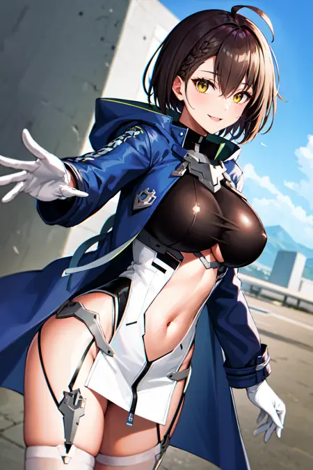 衣装1aabalti, short hair, ahoge, french braid, hooded coat, blue coat, open coat, underboob cutout, center opening, long sleeves, white gloves, garter straps, pelvic curtain, thighhighs