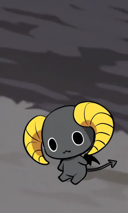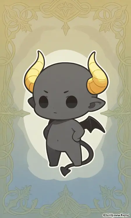 Lloromannic-Berry, black skin, Demon tail, horn, Demon, Chibi, black eyes, Bat wing, yellow horn, solo, 1boy