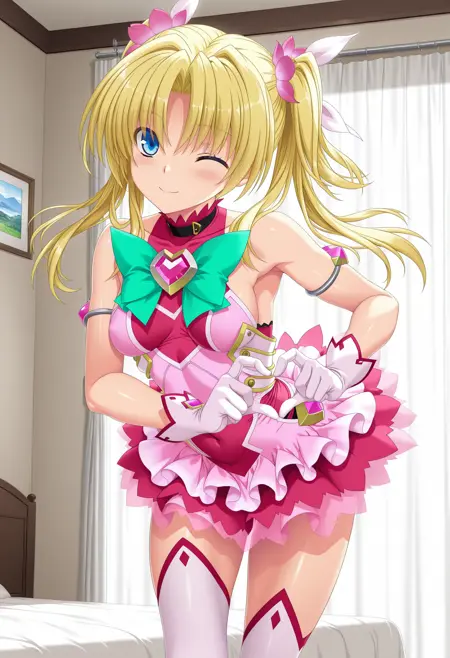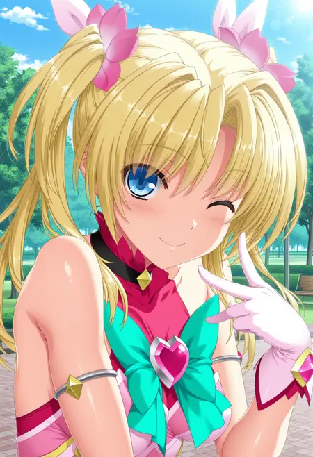masterpiece, absurdres, newest, 1girl, solo, c-sere, long hair, blonde hair, twintails, two side up, hair flower, hair ribbon, blue eyes, pink sleeveless dress, green bowtie, black collar, heart brooch, pink gloves, armlet, day, park, lens flare, looking at viewer, upper body, portrait, smile, one eye closed,