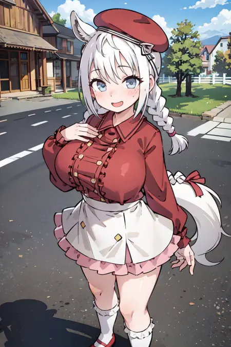 hat, braid, mary janes, beret, red footwear, long sleeves, red headwear, white socks, skirt, kneehighs, shoes, frills, red jacket