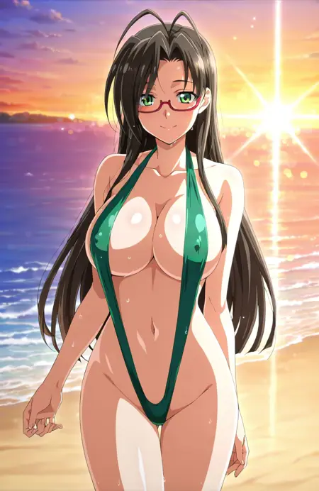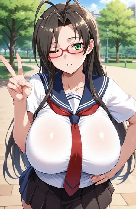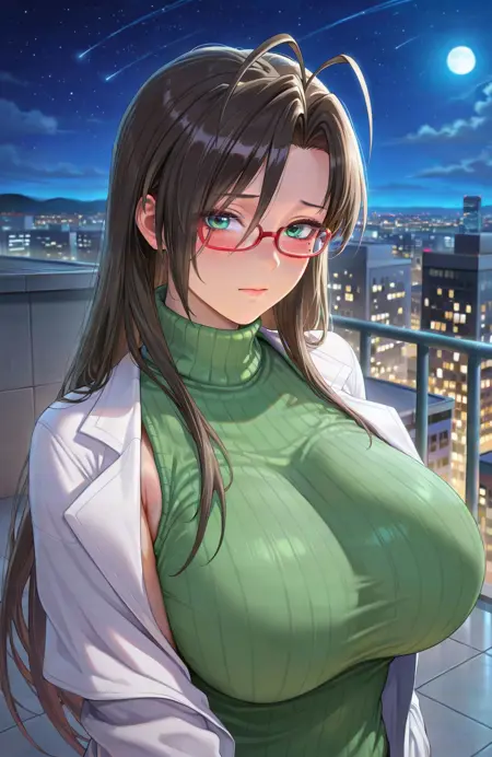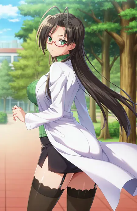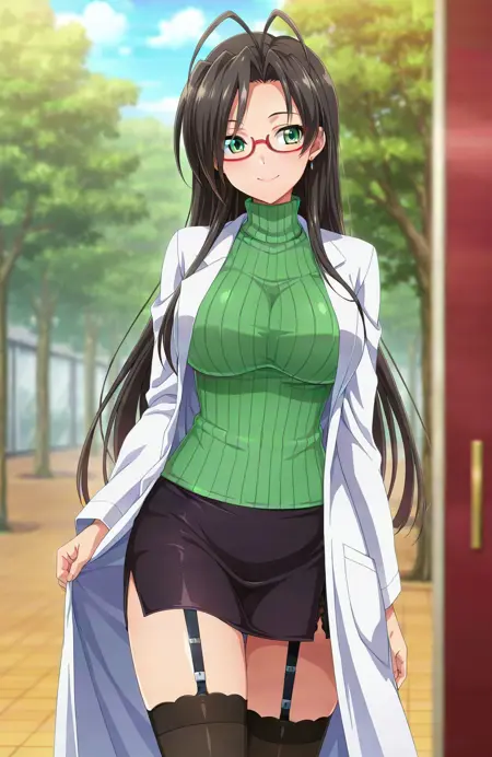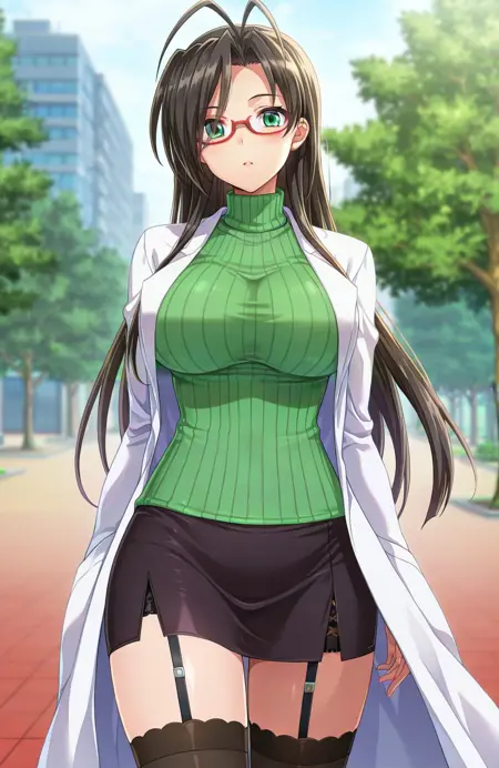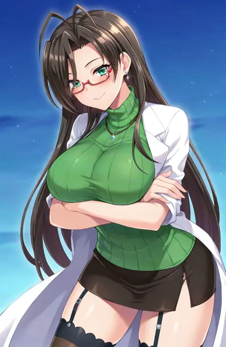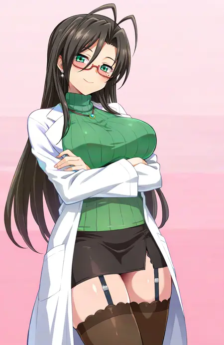 基本プロンプト: hasegawa chisato, 1girl, long hair, black hair, antenna hair, green eyes, glasses, red-framed eyewear, mole under eye, huge breasts, labcoat, green sweater, turtleneck sweater, black thighhighs, black miniskirt, garter straps, earrings, source_anime
