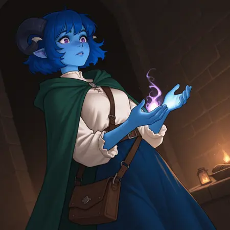 jesterM9,blue hair, purple eyes, freckles, blue skin,green cloak,white shirt,blue skirt