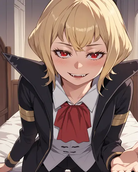1girl, solo, small breasts, pale skin, red eyes, blonde hair, short hair, black pants, long black coat, uniform, vampire