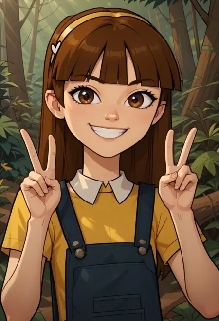 1girl, solo, Fiore_DC, 창백한 피부, 갈색 눈, 진한 갈색 머리카락, 길고 곧은 머리카락, 앞머리, 흰색 하트 무늬가 있는 노란 헤어밴드