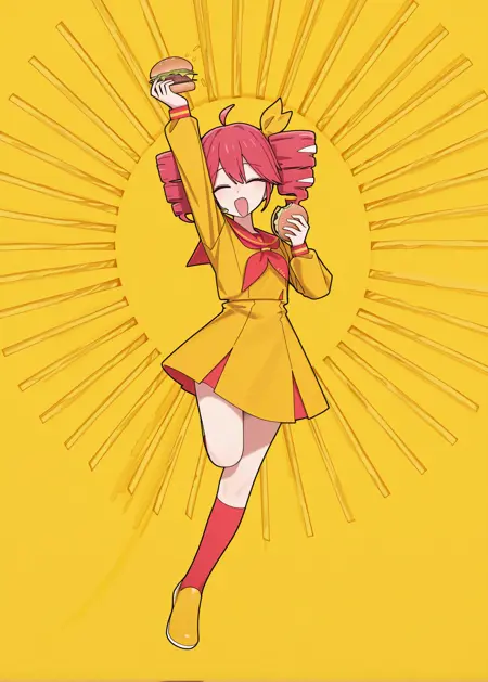 teteteteriteriteteteteriyaki pose, chibi, arm up, leg up, smile, open mouth, closed eyes, ahoge, burger, holding food, sunburst background