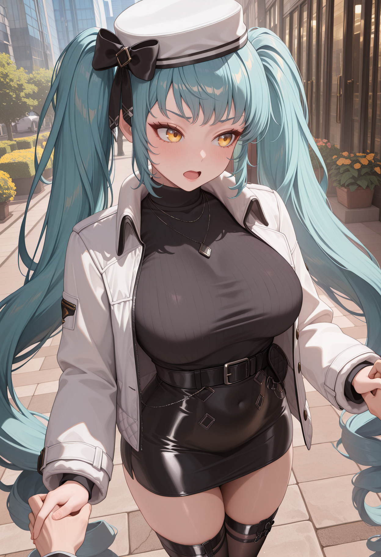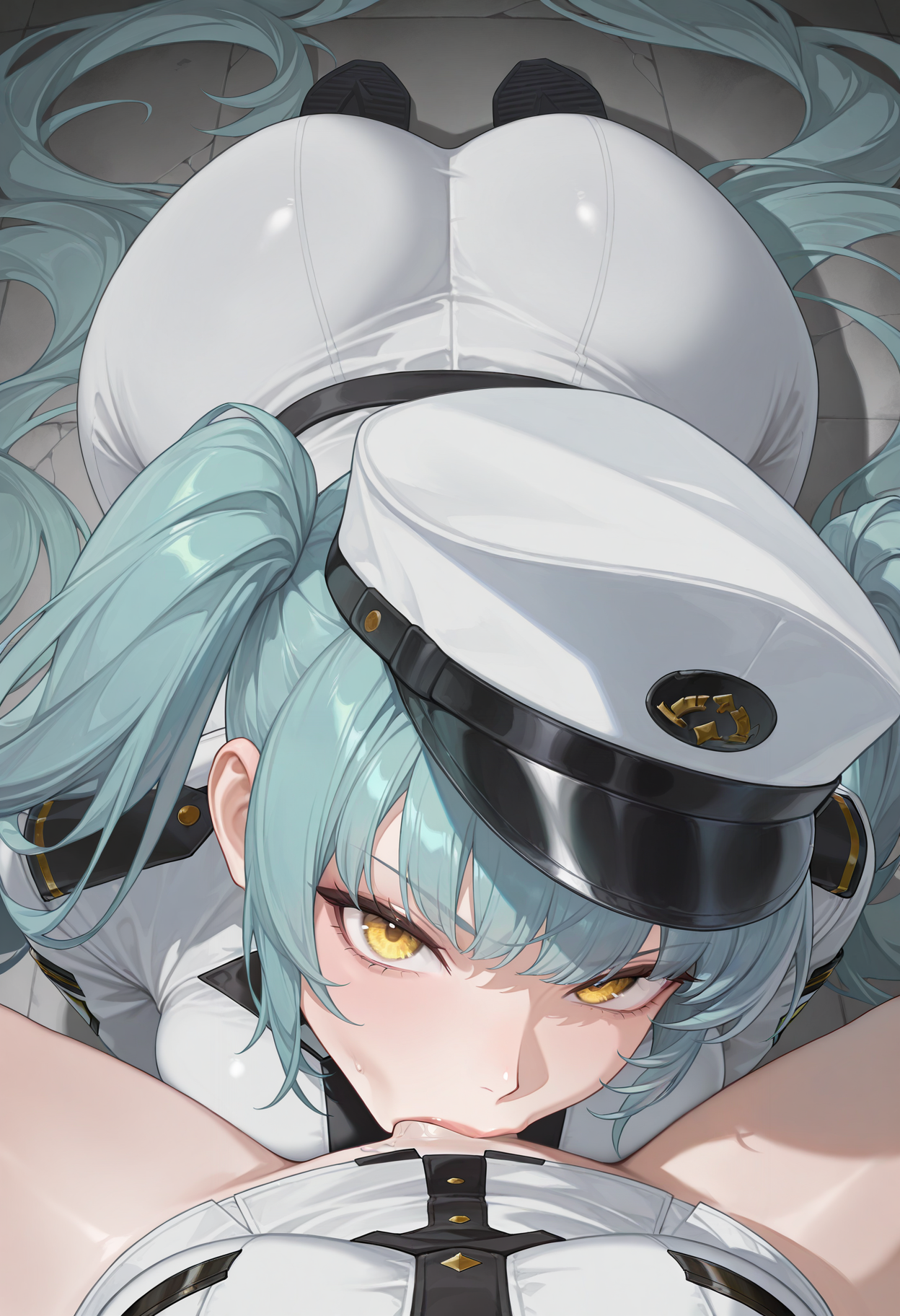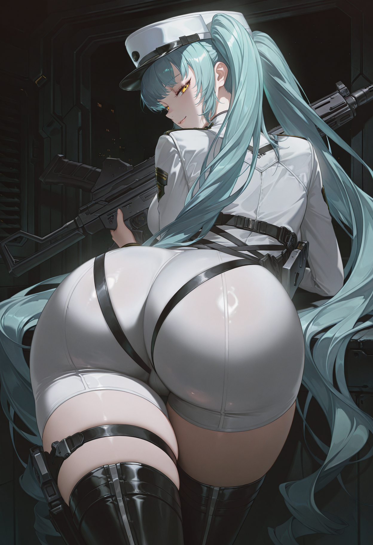 privdf, 노란 눈, 청록색 머리, 더블 테일, 매우 긴 머리, 앞머리, 뾰족한 모자, 흰색 모자, 큰 가슴, 군복, 흰색 재킷, 흰색 반바지, 하네스, 허벅지 스트랩, 검은 허벅지 부츠