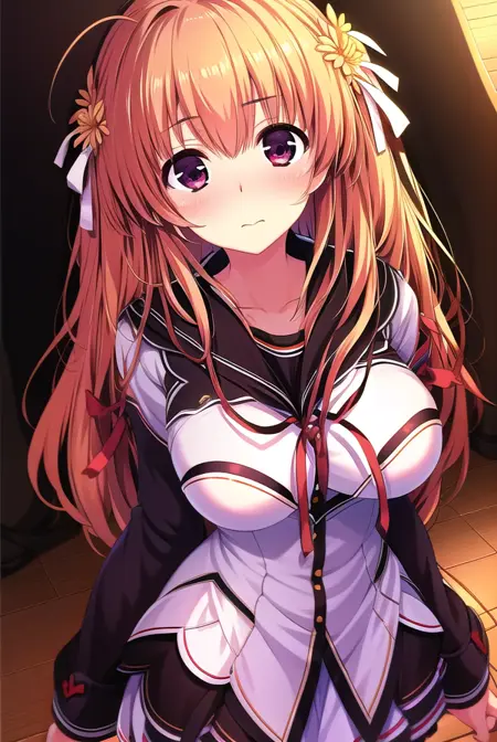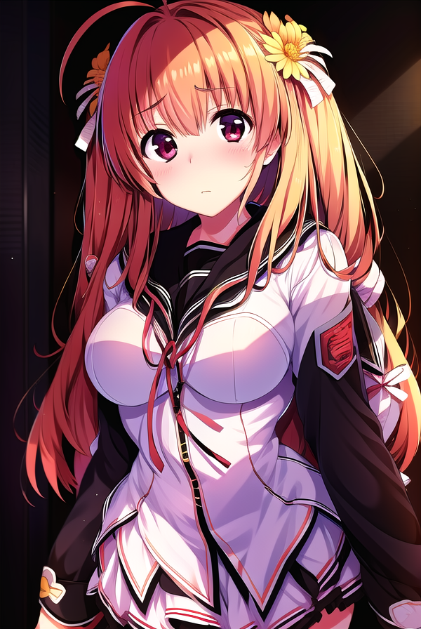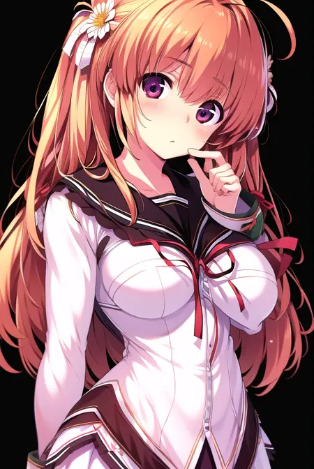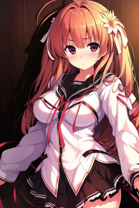 fuuka himekawa, long hair, hair ornament, ribbon, flower, ahoge, hair flower,