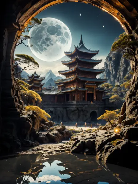 模型介绍:月光下的古城,天空中清澈的明月与镜面般的水面交相辉映,形成美丽的光影效果;