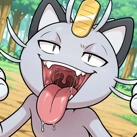 cat, pokemon (creature), gray fur, black eyes, fangs, whiskers, cat tail, head ornament,