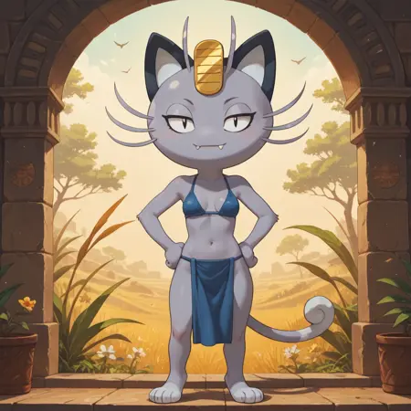 cat, pokemon (creature), gray fur, black eyes, fangs, whiskers, cat tail, head ornament,