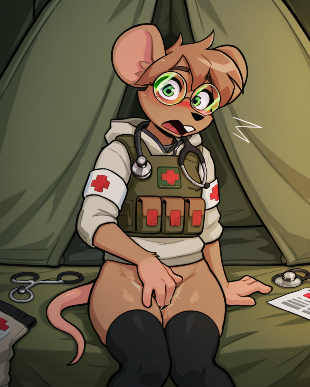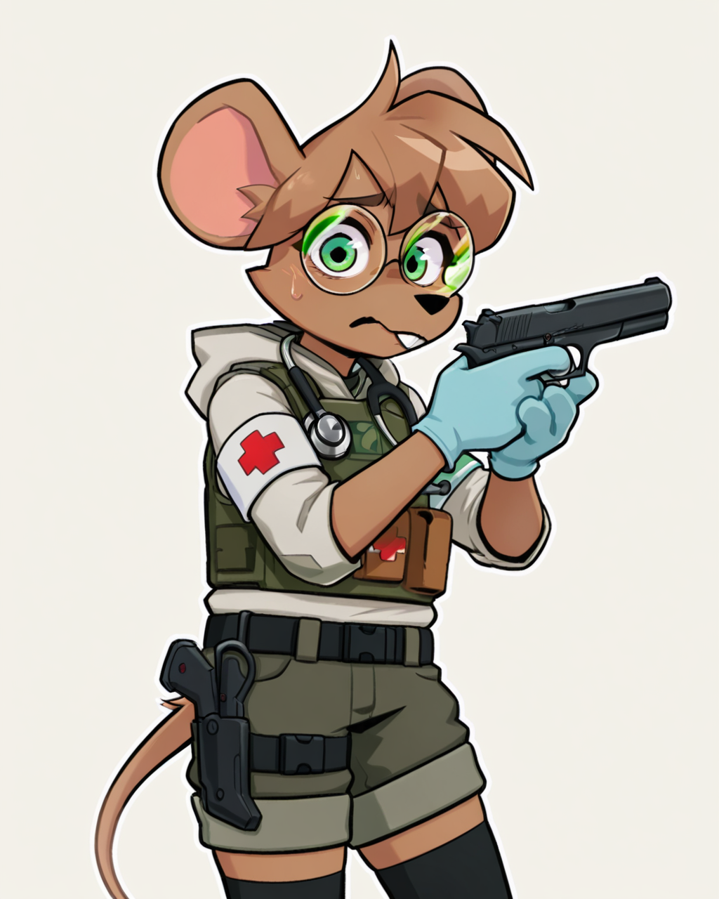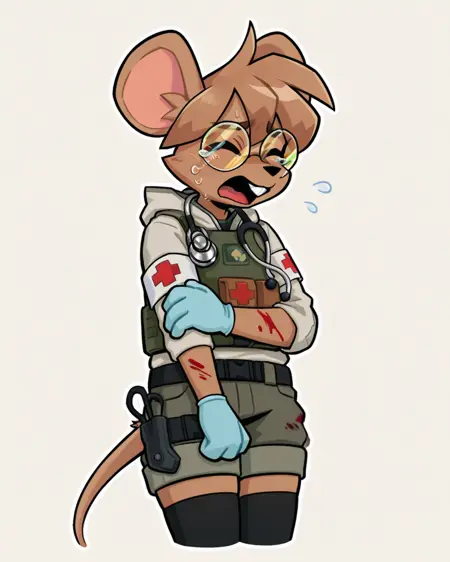 触发条件:鼠标、绿眼睛、防弹衣、圆框眼镜、听诊器、棕色头发、臂章、尾巴、棕色毛发、黑色过膝袜、战斗靴、门牙、手套、医疗兵、战术短裤、连帽衫、制服、短发,