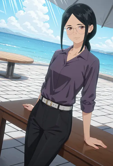 BullNagisa, brown eyes, black hair, long hair, low ponytail, sidelocks, glasses, rimless eyewear