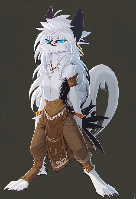 Body: toned feminine form, fluffy chest fur, digitigrade legs, curved hips, clawed hands, long tail