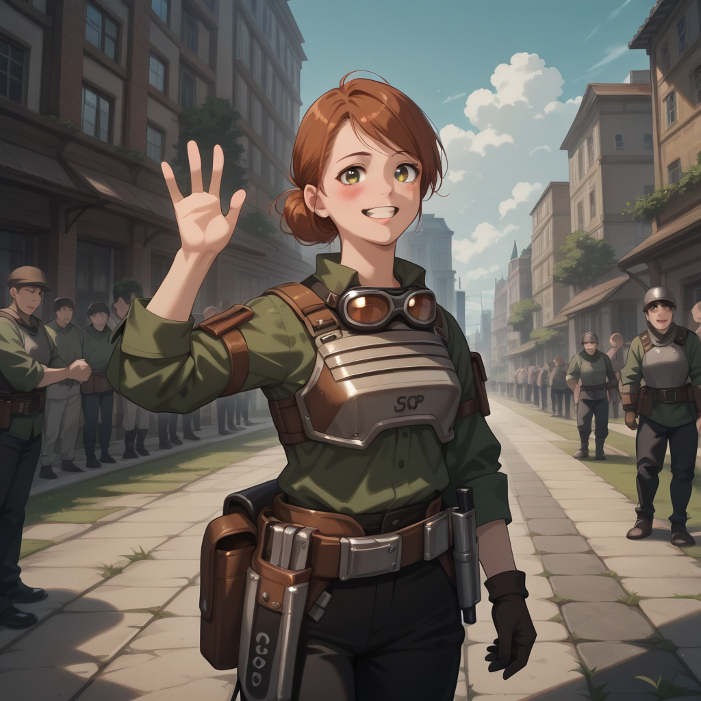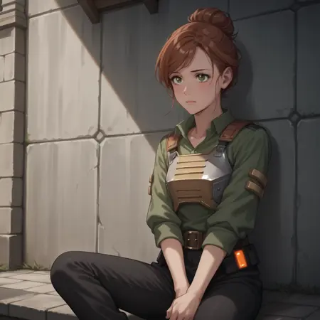 【트리거 단어】: Saska_Teft, 녹색 셔츠, 검은 바지, 가슴 갑옷, 안경, 도구 벨트