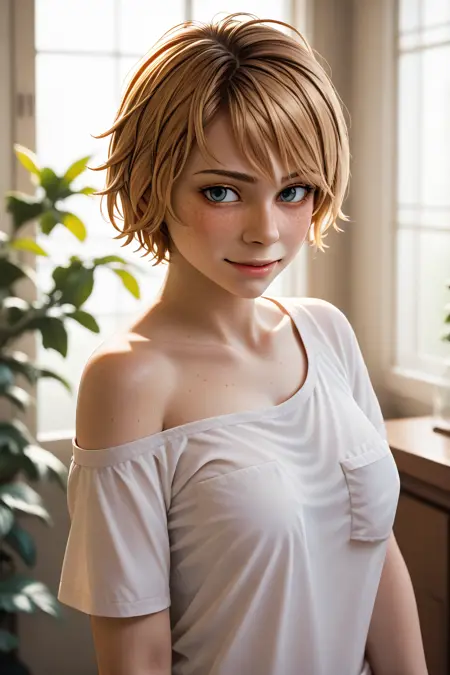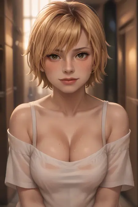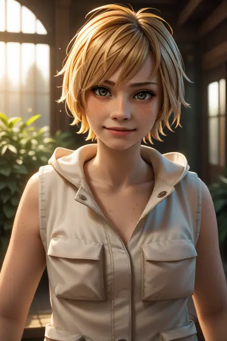 heather_mason, 金发, 短发, 雀斑, 背心, 高领, 短铅笔裙, 单人