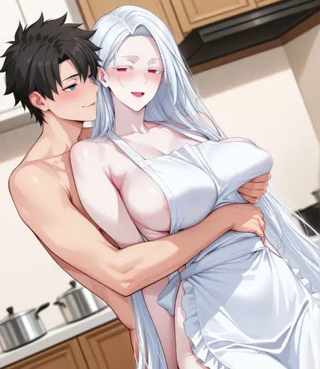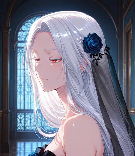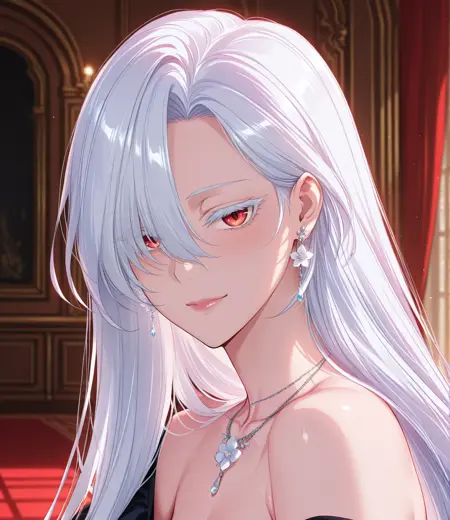 ravivansia, red eyes, white hair, long hair, very long hair, pale skin, long eyelashes, medium breasts,