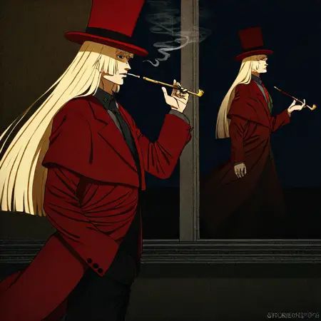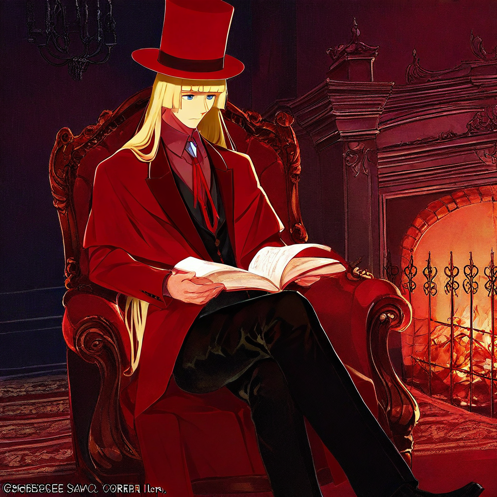 Cornelius, blonde hair, long hair, blue eyes, necktie, red suit, top hat