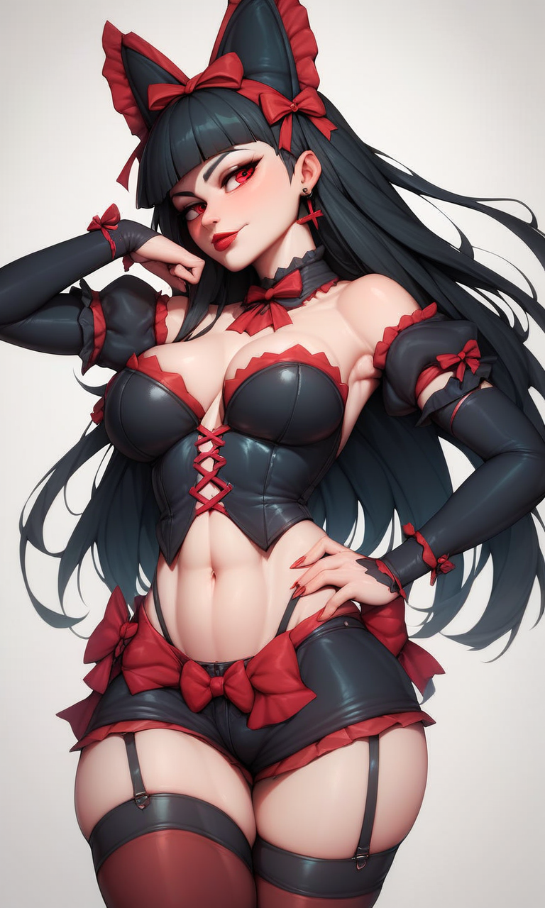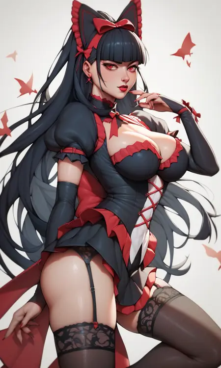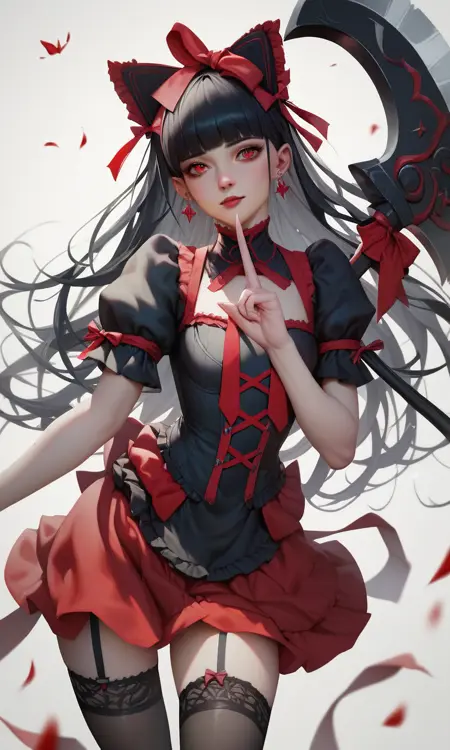 Rory Mercury, red eyes, black hair, long hair, gothic, ribbon, hair bow, garter straps, thighhighs, lipstick,
