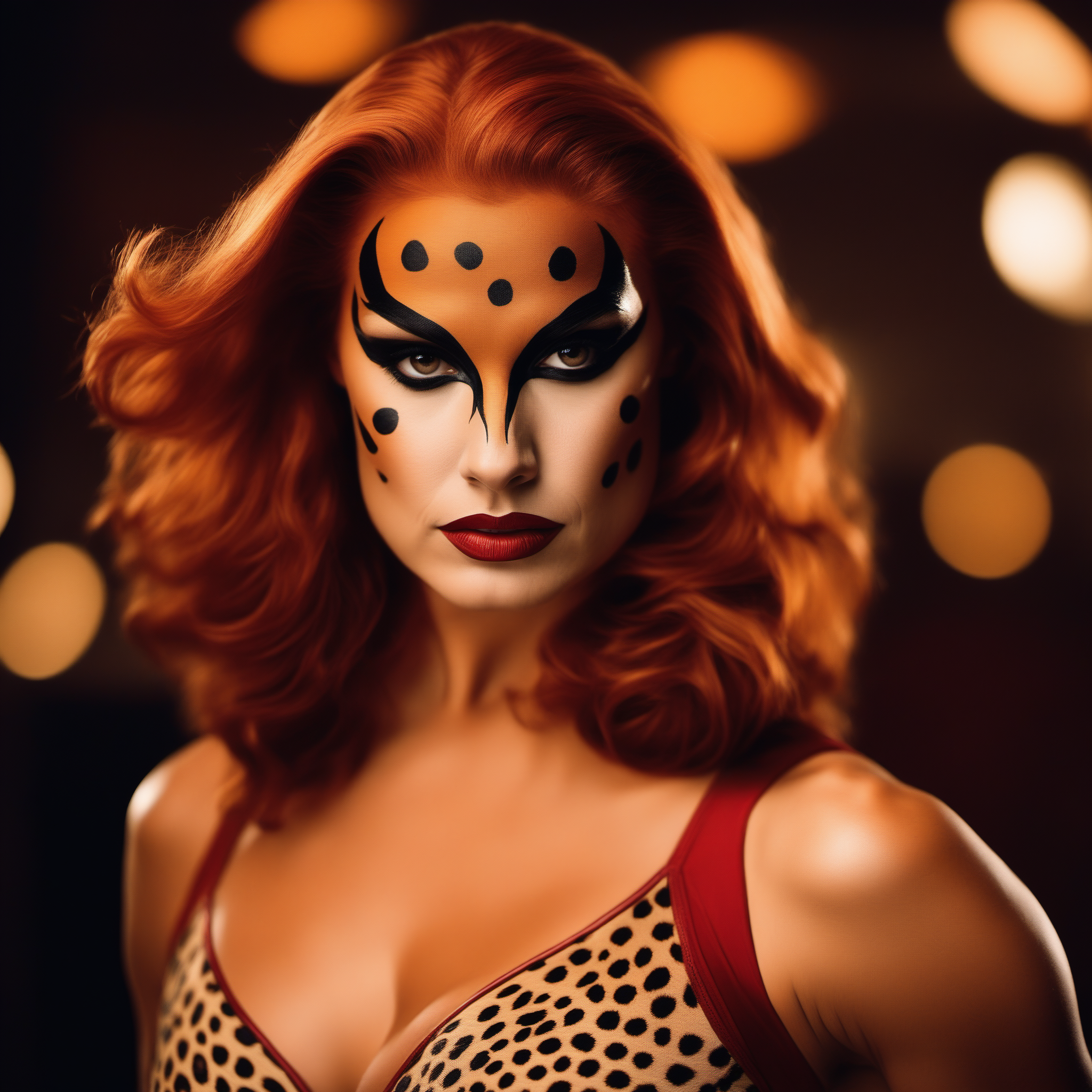 : (CheetaraQuiron character, lora:SDXL1.0\_quiron\_Cheetara\_v4p\_Lora:0.97 retro artstyle, cartoon, facepaint, skintight bodysuit, makeup, leotard, muscle body,