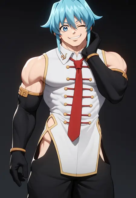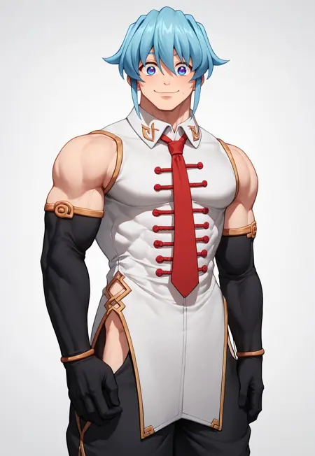 Shen, blue eyes, blue hair, short hair, muscular, chinese clothes, sleeveless shirt, white shirt, red necktie, elbow gloves, black pants, baggy pants, bandages on legs, black shoes