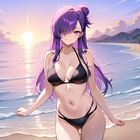 Additional: hair over one eye, long hair, purple hair, single hair bun, purple eyes, armor, cleavage, cape, choker, asymmetrical clothes, thighhighs
