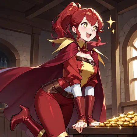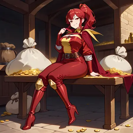 Additional: red hair, ponytail, heels,red knee boots, cape, red pants, red and yellow top, belt