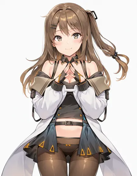 K2def, def_off-shoulder_coat, def_detached_collar, def_cropped_shirt, off-shoulder shirt, def_skirt, def_belt, def_pantyhose, def_fingerless_gloves, def_panties, K2_hairclip, K2_hair_ornament, pantyhose 下穿内裤