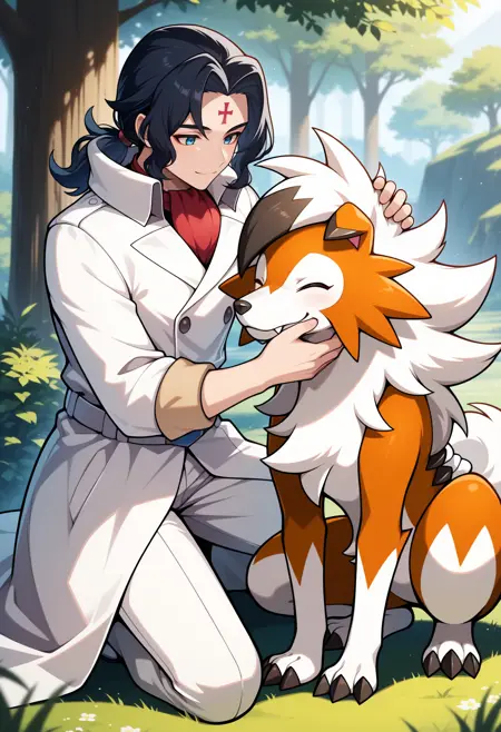 kresnikSMT, black hair, low ponytail, blue eyes, cross forehead mark, red ascot, white trench coat, sleeves rolled up, white gloves, white belt, white pants, white shoes