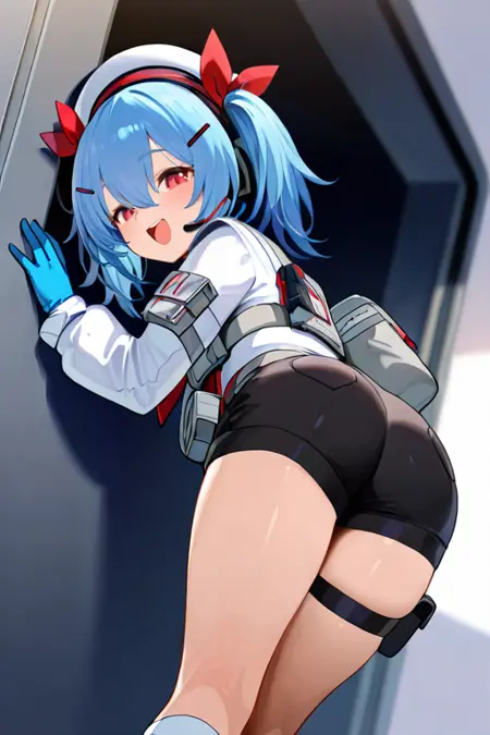 1girl, solo, colphne_(girls'_frontline_2), 蓝发, 双马尾, 发夹, 红色发带, 发丝遮眼, 红眼,