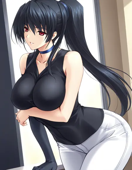 파란 목걸이, 검은 셔츠, 불가능한 셔츠, 소매 없음, 클라비컬 뼈, 한쪽 장갑, 비대칭 장갑, 흰색 바지